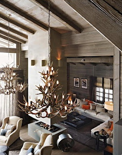Una sala rústica con vigas de madera desde donde cuelgan lámparas en forma de pequeñas ramas de árbol o cuernos de alces que acentúan el estilo.